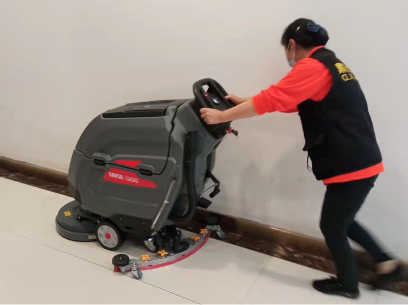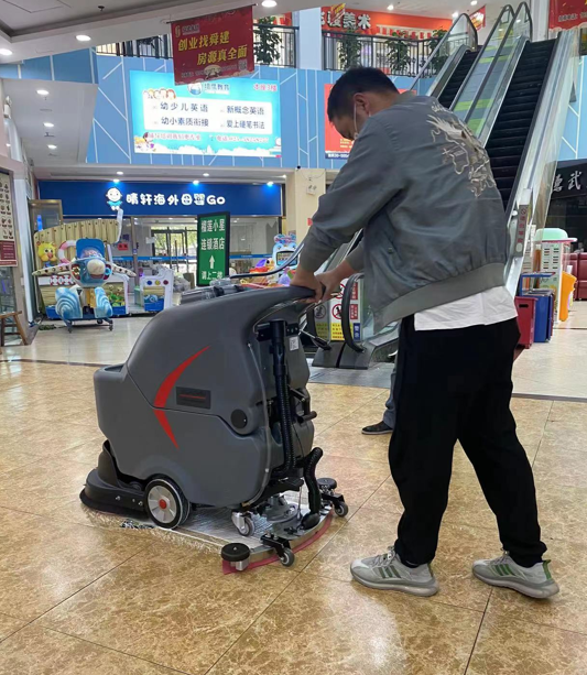 手推式洗地機(jī):體積小、靈活輕便,適用于清潔狹窄處和角落區(qū)域的地面,如各樓層的購物區(qū)、通道等。工作人員只需控制清潔方向和速度,適合節(jié)假日人流擁擠時(shí)使用。