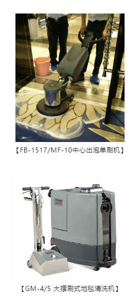 地毯清洗機(jī):深度清潔、快速干燥,確保地毯可立即投入使用,可選不同機(jī)型,進(jìn)行地毯中期保養(yǎng)或者徹底清洗。(中期清洗: FB-1517/MF-10中心出泡單刷機(jī)/泡箱;翻新清洗:GM-4/5 大擺刷式地毯清洗機(jī))