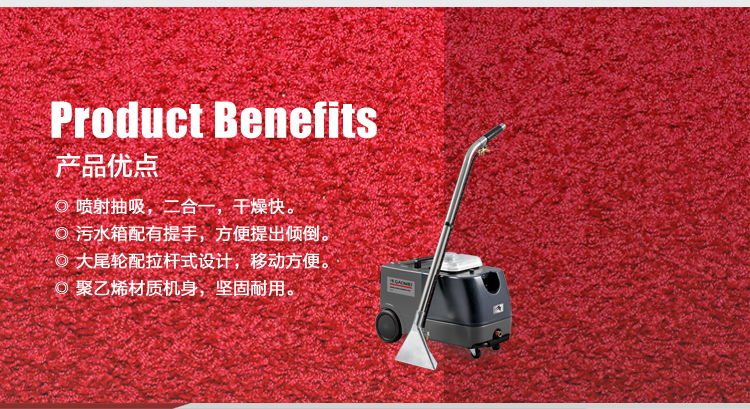 利用溫?zé)崴畤娚淙芙馕蹪n,同時(shí)將污水抽拔出并吸進(jìn)污水箱,干燥迅速,2小時(shí)即可營業(yè),可清潔小面積地毯。適用于地毯商店、汽車美容、汽車經(jīng)銷商、辦公室以及保潔公司。