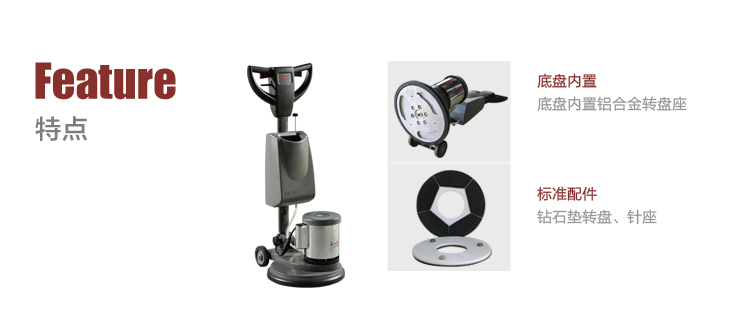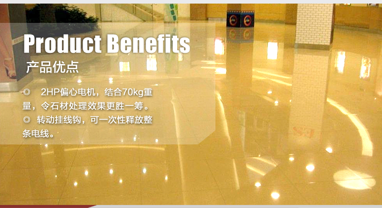 根據(jù)力學(xué)原理采用偏心電機(jī)設(shè)計(jì),結(jié)合底盤(pán)內(nèi)置鋁合金轉(zhuǎn)盤(pán)座設(shè)計(jì),讓操作更輕便;70kg機(jī)器凈重,2HP電機(jī)扭力強(qiáng)大,令石材處理效果更勝一籌;專(zhuān)為石材翻新和晶面處理而設(shè)計(jì)。適合賓館、酒店等大面積鋪設(shè)石材的場(chǎng)所。