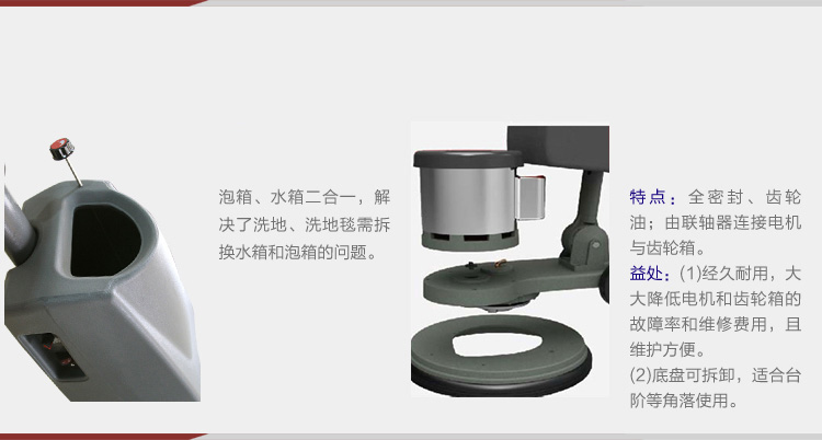 泡箱、水箱二合一,解決了洗地、洗地毯需拆換水箱和泡箱的問題。